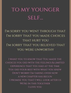 The saying in the photo is something that I am now able to say to myself with almost 100% confidence. I am beginning to understand now; in my continued sobriety, that I really did make decisions that hurt myself because I did not know any better. I am not a horrible person. I am a good person who did horrible things in a desperate attempt to survive. Sometimes to survive what was being done to me, sometimes to survive myself. As a sober adult, I now can protect and take care of and comfort the younger me who didn’t know any better.